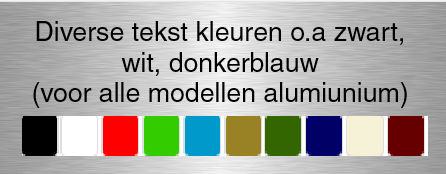 Je kunt je aluminium naamplaat volledig naar wens aanpassen. Kies uit verschillende kleuren, zoals zwart, wit, goud of bordeaux, en selecteer het gewenste lettertype, van klassiek tot modern. Daarnaast heb je de keuze uit diverse tekstkleuren, waaronder zwart, wit en donkerblauw. Ook de uitlijning van de tekst bepaal je zelf, of je nu de voorkeur geeft aan een uitlijning links, in het midden of rechts.
