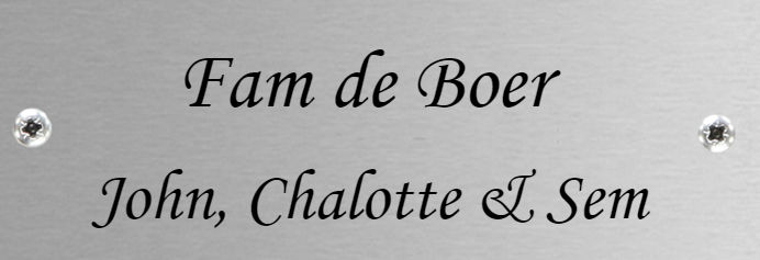 Je hebt de keuze uit verschillende bevestigingsopties: zelfklevend, met gaatjes of met schroefjes erbij. Dit maakt de montage eenvoudig, ongeacht de ondergrond. Ook het onderhoud is simpel: een vochtige doek is genoeg om de naamplaat in topconditie te houden. Met zijn strakke afwerking en duurzame materialen gaat deze naamplaat jarenlang mee.