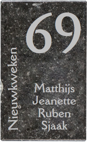 Natuursteen heeft tal van voordelen, en ons blauwsteen naambord is daarop geen uitzondering. De natuurlijke steenstructuur zorgt ervoor dat ieder bord uniek is. Bovendien is het naambord weerbestendig, wat betekent dat het bestand is tegen regen, zon en wind. Hierdoor blijft het er jarenlang als nieuw uitzien, zonder dat je je zorgen hoeft te maken over onderhoud.