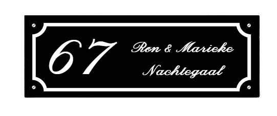 Het aanbrengen van je nieuwe naambordje gaat zonder gedoe. Kies uit verschillende bevestigingsmogelijkheden, zoals gaatjes, zelfklevend of met schroefjes. Dit maakt het eenvoudig om je naambordje te plaatsen waar jij het wilt. Wij adviseren om het bord af en toe af te nemen met een vochtige doek voor een extra lange levensduur. Heb je vragen of specifieke wensen? Neem dan gerust contact met ons op via telefoon of e-mail; wij staan voor je klaar om te helpen!