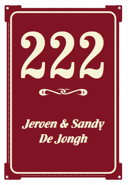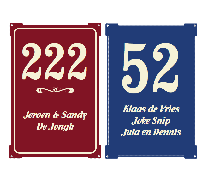 Je kunt de naamplaat helemaal personaliseren met jouw eigen tekst en huisnummer. Kies uit verschillende lettertypes zoals Univers, Times New Roman of BankGothic, en bepaal zelf de kleuren voor het bord en de tekst. Wil je een bord dat opvalt in het zwart, of ga je voor het nostalgische crème? De mogelijkheden zijn eindeloos, zodat je altijd iets unieks krijgt dat bij jouw stijl past!