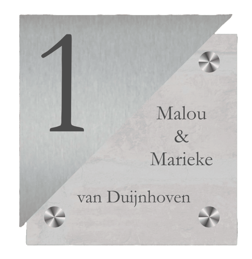 Wil je graag een voorbeeld zien van hoe je naambord eruit zal komen te zien? Vink dan de optie "Ik wil graag vooraf een voorbeeld ontvangen" aan tijdens je bestelling. We sturen je een digitaal voorbeeld, zodat je alles kunt controleren en aanpassen voordat we het definitieve product maken.