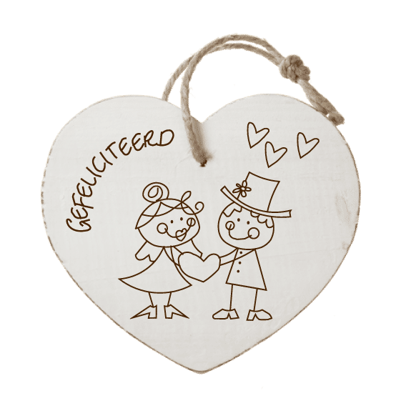 Vier de liefde en het huwelijk met ons prachtige houten hart 'Huwelijk gefeliciteerd'. Met een afmeting van 18 x 16 cm en een dikte van 2 cm, biedt dit hart de perfecte manier om je felicitaties over te brengen. Het hart is gemaakt van hout met een witte coating en wordt met precisie gegraveerd door middel van lasergraveren, waardoor het een elegant en blijvend aandenken is.