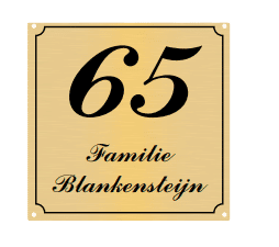 Bij naambordkopen.nl kunt u uw messing naambordje geheel naar eigen smaak aanpassen. Kies uit verschillende lettertypen, zoals Arial of Times New Roman, en pas de tekstkleur aan om perfect bij uw stijl te passen. U kunt maximaal vijf regels tekst toevoegen, zodat uw naam, huisnummer of bedrijfsnaam altijd duidelijk en stijlvol wordt weergegeven. Voor de bevestiging zijn er meerdere opties beschikbaar, zoals gaatjes met schroefjes of zelfklevend materiaal.