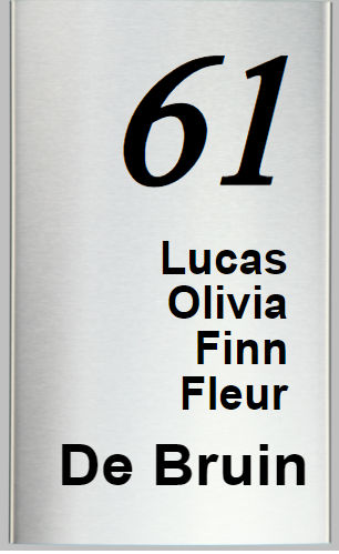 Zoek je een rvs naambord die je naar wens kunt indelen? Onze naamborden zijn zeer geschikt om te personaliseren. Dit bordje kent een afmeting van 15 x 25 cm. Voeg je eigen tekst toe en creëer een naamplaat rvs gebogen volledig naar wens. Je kunt op dit rvs naambordje 8 regels aan tekst plaatsen. Het op maat gemaakte en unieke voordeurbordje heb je binnen 2 tot 5 dagen in huis.