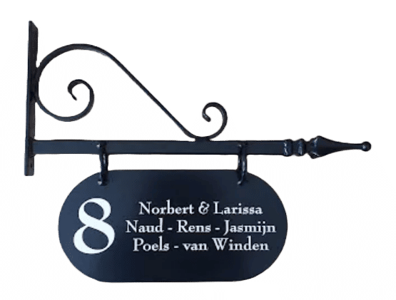Onze uithangborden worden ambachtelijk geproduceerd en zijn volledig gepoedercoat, wat betekent dat je ze jarenlang kunt laten hangen zonder dat ze roesten. Je kunt kiezen uit verschillende kleuren, zoals zwart, groen of blauw, en zelfs de tekstkleuren zijn aanpasbaar in wit of crème. Personalisatie is eenvoudig: je kunt drie regels tekst toevoegen, met keuze uit diverse lettertypen zoals Arial of Times New Roman. Uw tekst wordt aan beide kanten geplaatst. Vind je het lastig om de juiste keuzes te maken? Geen probleem! Wij staan klaar om je te helpen met advies en tips.