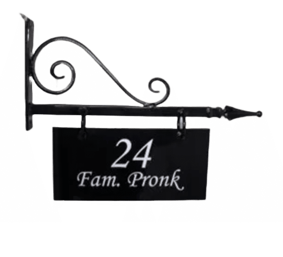 Je kunt het uithangbordje volledig personaliseren door je huisnummer en tekst toe te voegen op maximaal 3 regels aan beide kanten vinyl beletterd. Kies uit diverse lettertypes zoals Arial of Times New Roman en geef aan welke kleur je wilt voor de tekst. Wij zorgen dan voor een prachtig resultaat. Heb je hulp nodig of heb je specifieke wensen? Neem gerust contact met ons op via 072 8888 636 of per e-mail op [email protected]. We staan altijd voor je klaar om je te helpen met het ontwerp!