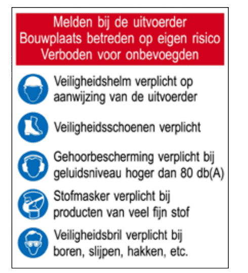 Tekst: Melden bij uitvoerder - Bouwplaats Betreden op eigen Risico - Verboden voor onbevoegden