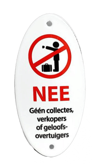 Emaille bordje NEE, Geen collectes, verkopers of geloofsovertuigers